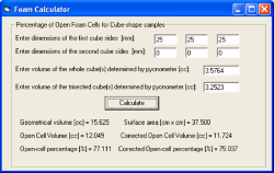 From the geometric volume, and the first and second pycnometric runs, parameters like porosity, percentages of closed and opened cells can be