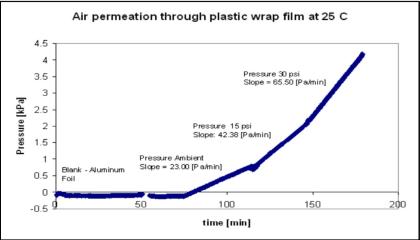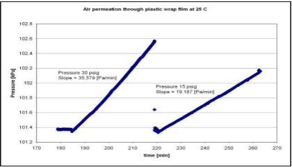 Calculation of gas transport rates and permeability coefficient The volume Vc of the pycnometer chamber can be easily measured (as in regular true density measurements). Knowing the Vc , temperature, and applying the ideal gas law, the experimentally observed pressure rise versus time curve can be converted to volume V of gas (at STP) that permeated through the film or membrane, yielding the curve V versus time. Since the V is a product of permeability coefficient, effective area, pressure differential, and time divided by the thickness of the specimen, appropriate re-plotting of the curve yields the permeability coefficient as the slope.